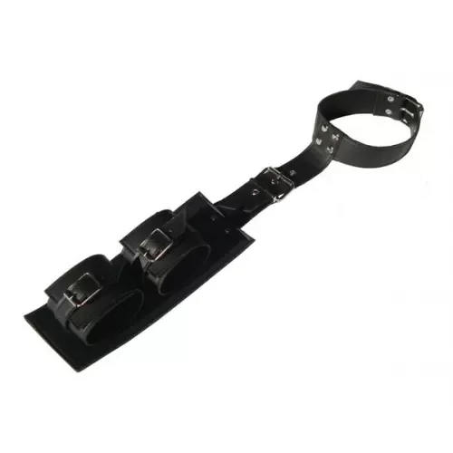 Collar inmovilizador con esposas que se coloca en la espalda, para una sumisión total. Tanto el collar como las esposas son regulables.