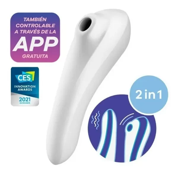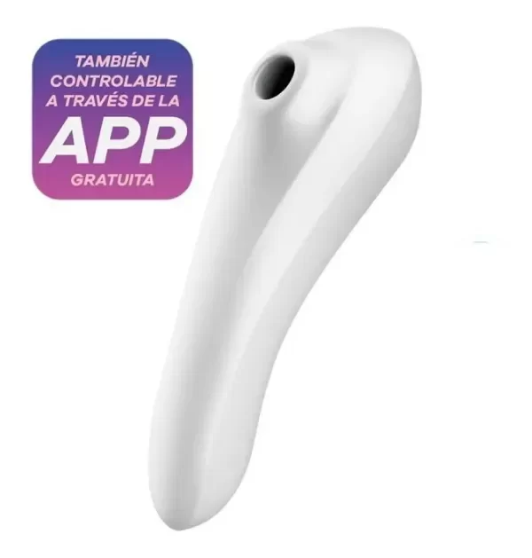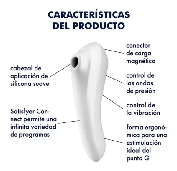 Satisfyer Dual Pleasure Succionador + Vibrador. El Satisfyer Dual Pleasure está hecho especialmente para estimular tanto el clítoris como el Punto G. Este dispositivo combina ondas de presión vibradoras con un mango ergonómico vibrador y puede se puede controlar mediante una aplicación para el celular gratuita Satisfyer Connect. Con un mango ligeramente curvado fabricado con silicona segura para el cuerpo, este generador de lujuria es capaz de estimular no solo el punto G, ya que el otro extremo también se puede utilizar para la estimulación del clítoris y mimar tu perla mediante ondas de presión pulsantes. Como el Dual Love es impermeable (IPX7), te puede acompañar con mucho gusto a la ducha, y además se puede limpiar fácilmente con agua tibia y un jabón suave. Asegura tu placer..